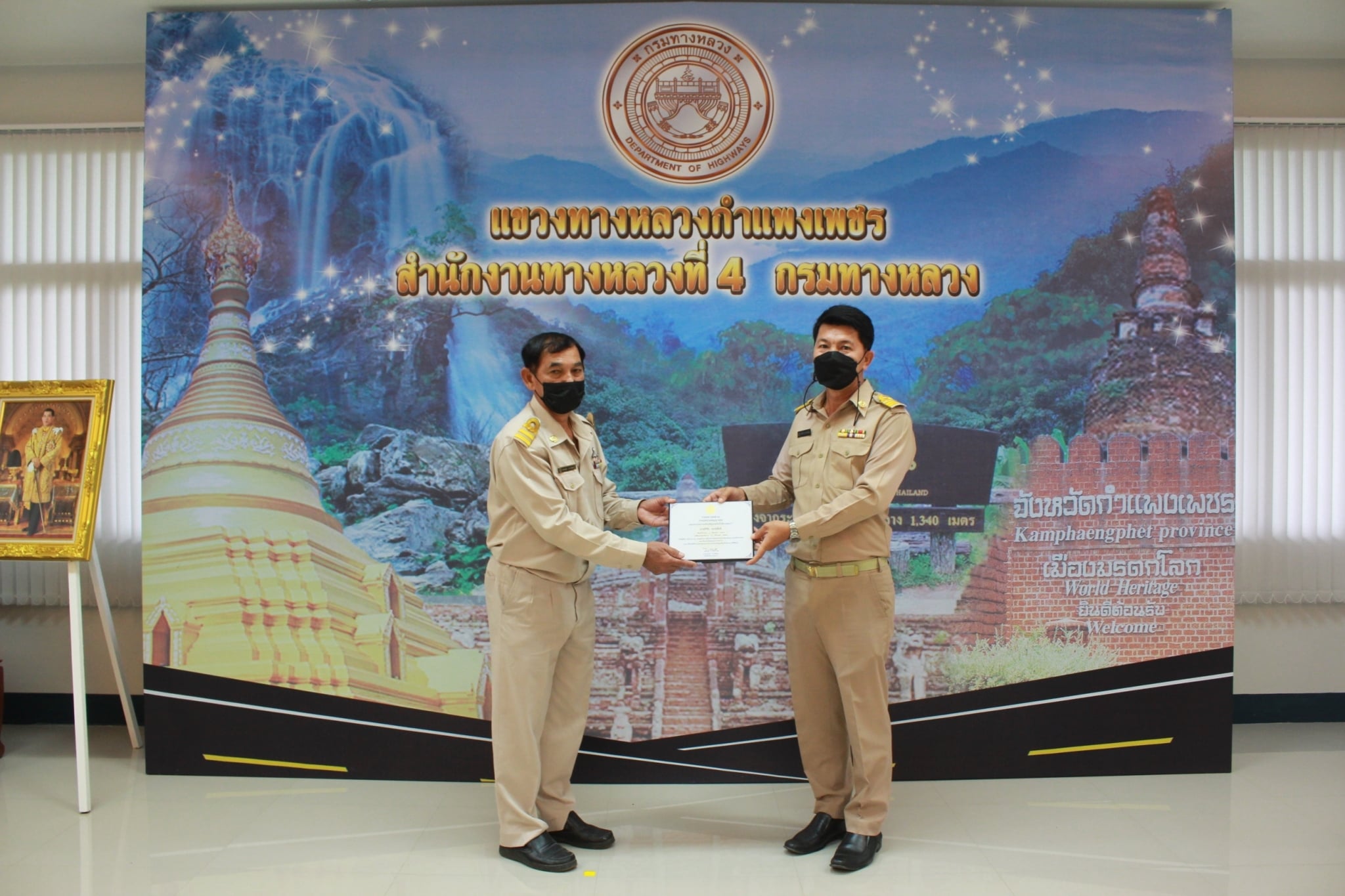นายชัยศิริ ผูกใจเพื่อน เป็นประธานมอบโล่ที่ระลึกแก่เจ้าหน้าที่แขวงทางหลวงกำแพงเพชร ที่เกษียณอายุราชการประจำปี 2564