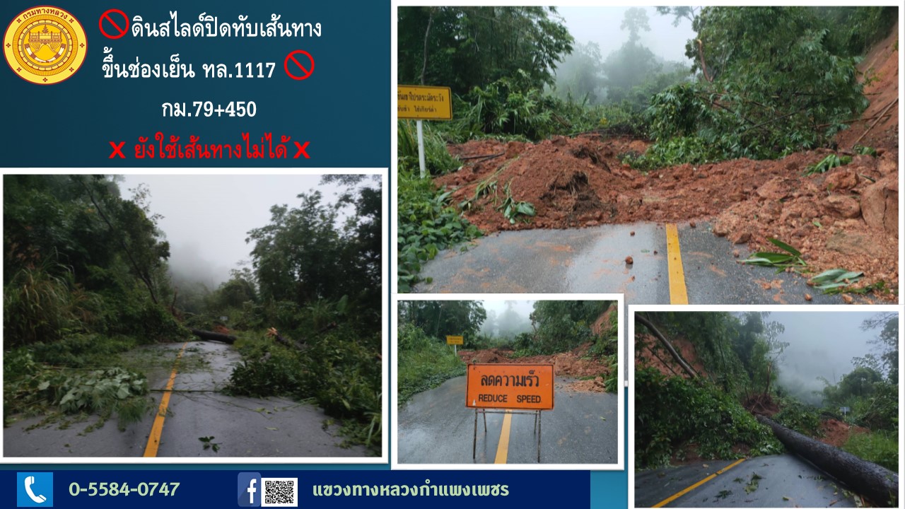 ข่าวประชาสัมพันธ์แขวงทางหลวงกำแพงเพชร วันที่ 26 กันยายน 2564 "ดินสไลด์ปิดทับเส้นทางขึ้นช่องเย็น ทล.1117 กม.79+450"
