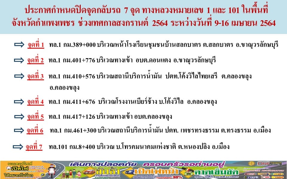 ประกาศกำหนดปิดจุดกลับรถ 7 แห่ง บริเวณ ทางหลวงหมายเลข 1 และ 101 ในพื้นที่จังหวัดกำแพงเพชร ช่วงเทศกาลสงกรานต์ 2564 ระหว่างวันที่ 9-16 เมษายน 2564 เพื่ออำนวยความสะดวกและปลอดภัยสำหรับท่านที่ใช้เส้นทาง
