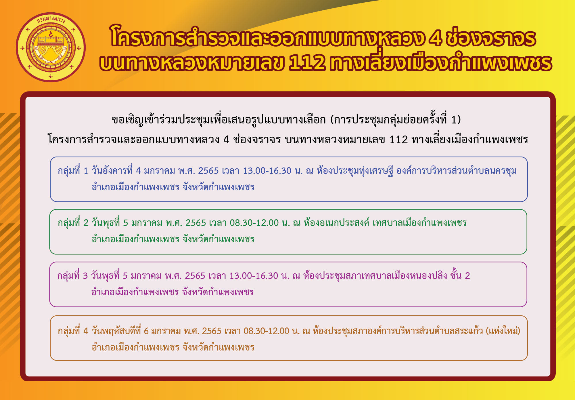 ขอเชิญผู้สนใจเข้าร่วมประชุมเพื่อเสนอรูปแบบทางเลือก (การประชุมกลุ่มย่อยครั้งที่ 1) โครงการสำรวจและออกแบบทางหลวง 4 ช่องจราจร บนทางหลวงหมายเลข 112 ทางเลี่ยงเมืองกำแพงเพชร ในช่วงวันที่ 4-6 มกราคม 2565