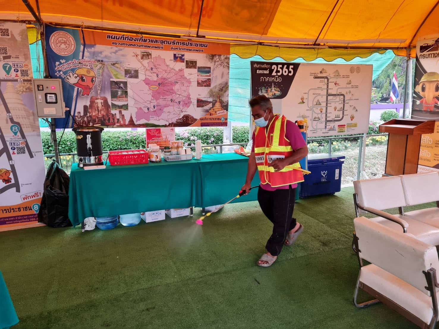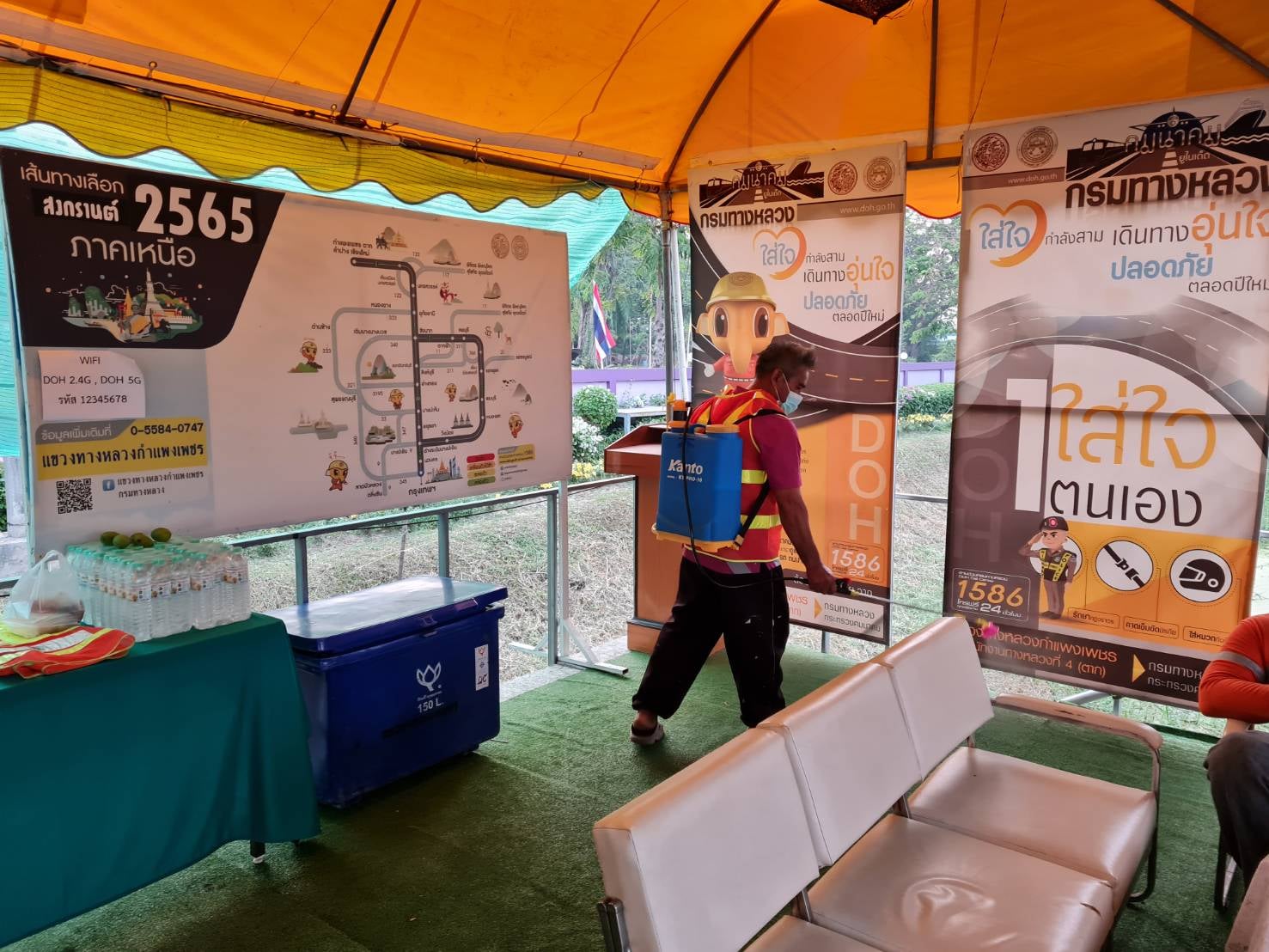 แขวงทางหลวงกำแพงเพชร เตรียมพร้อมจุดบริการประชาชน เต็นท์หน้าแขวงทางหลวงกำแพงเพชร ทางหลวงหมายเลข 1 ตอนปากดง-นครชุม ที่ กม.453+076 ด้านซ้ายทาง