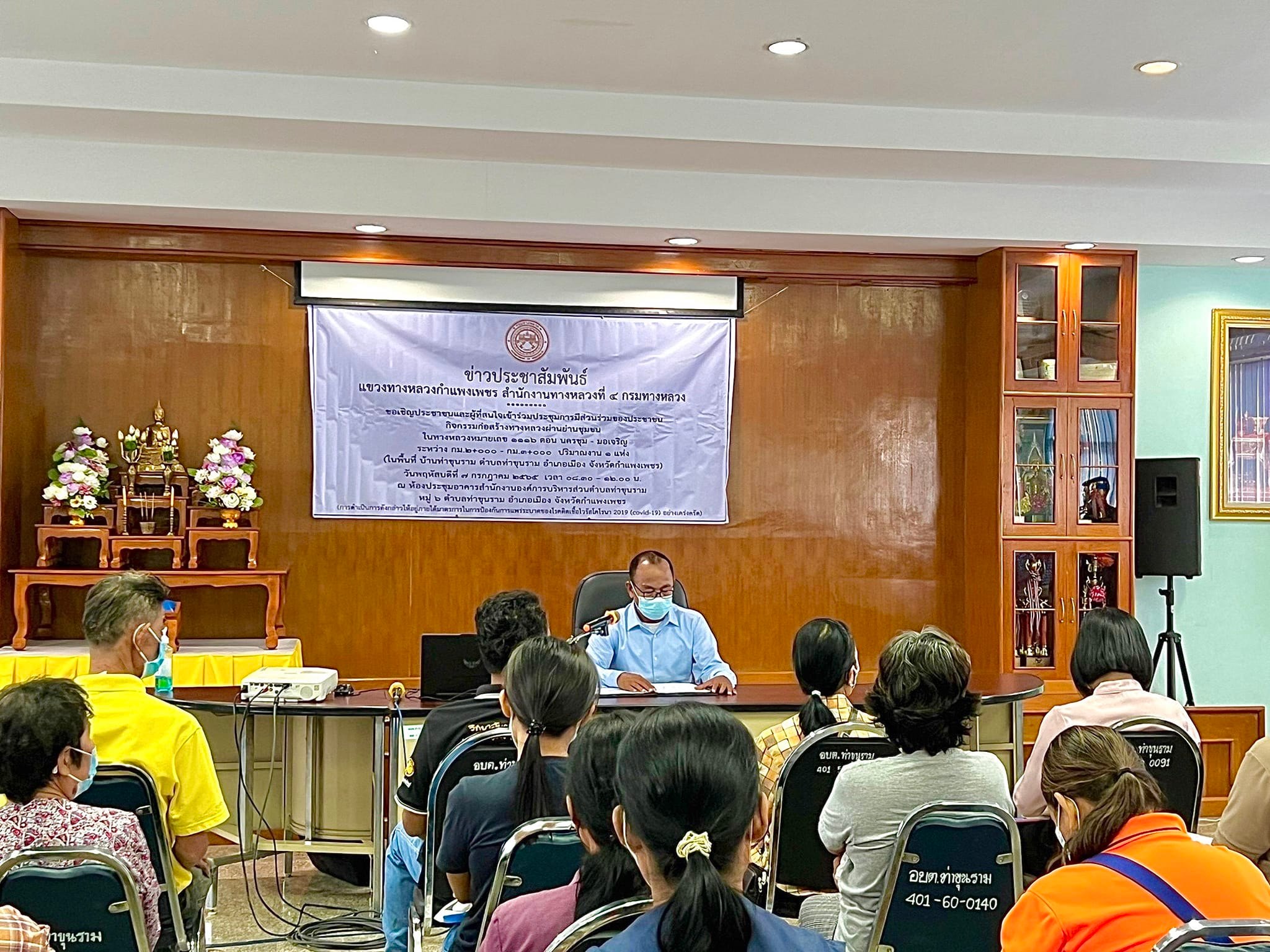 วันพฤหัสบดี ที่ 7 กรกฎาคม 2565 เวลา 09.00 น. นายชัยศิริ ผูกใจเพื่อน ผู้อำนวยการแขวงทางหลวงกำแพงเพชร มอบหมายให้นายสุชาติ ตาทิพย์ รองผู้อำนวยการฝ่ายวิศวกรรม นำคณะหัวหน้าหมวดทางหลวง และเจ้าหน้าที่แขวงฯ จัดประชุมการมีส่วนร่วมของประชาชน เพื่อปรับปรุงขยายผิวทางจราจร จาก 2 ช่อง เป็น 4 ช่องจราจร โครงการก่อสร้างทางหลวงผ่านย่านชุมชน ทางหลวงหมายเลข 1116 ตอนนครชุม-มอเจริญ ระหว่าง กม.2+000-กม.3+000 ณ ห้องประชุมอาคารสำนักงานองค์การบริหารส่วนตำบลท่าขุนราม ในการนี้ นายประจวบ ชมภู นายกองค์การบริหารส่วนตำบลท่าขุนราม เป็นประธานในพิธีเปิดการประชุม ซึ่งในที่ประชุมมีมติเห็นด้วยในการดำเนินโครงการ