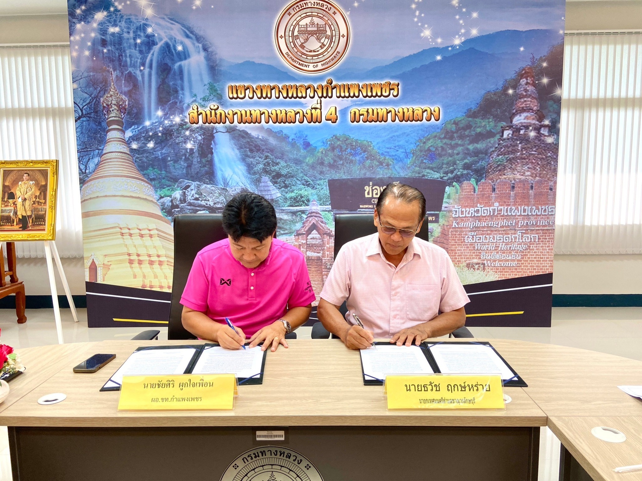 วันอังคาร ที่ 7 พฤศจิกายน 2566 เวลา 09.00 น. ณ ห้องประชุมแขวงทางหลวงกำแพงเพชร นายชัยศิริ ผูกใจเพื่อน ผู้อำนวยการแขวงทางหลวงกำแพงเพชร พร้อมด้วยนายธวัช ฤกษ์หร่าย นายกเทศมนตรีตำบลขาณุวรลักษบุรี ได้ร่วมทำบันทึกข้อตกลง (MOU) โครงการปรับปรุงภูมิทัศน์เกาะกลางถนน ในการให้เทศบาลตำบลขาณุวรลักษบุรีเข้าไปดูแลบำรุงรักษาเกาะกลางถนนในเขตทางหลวง บริเวณทางหลวงหมายเลข 1074 ตอนสลกบาตร – ทุ่งสนุ่น ระหว่าง กม.8+034 – กม.8+275 ท้องที่ตำบลแสนตอ อำเภอขาณุวรลักษบุรี จังหวัดกำแพงเพชร