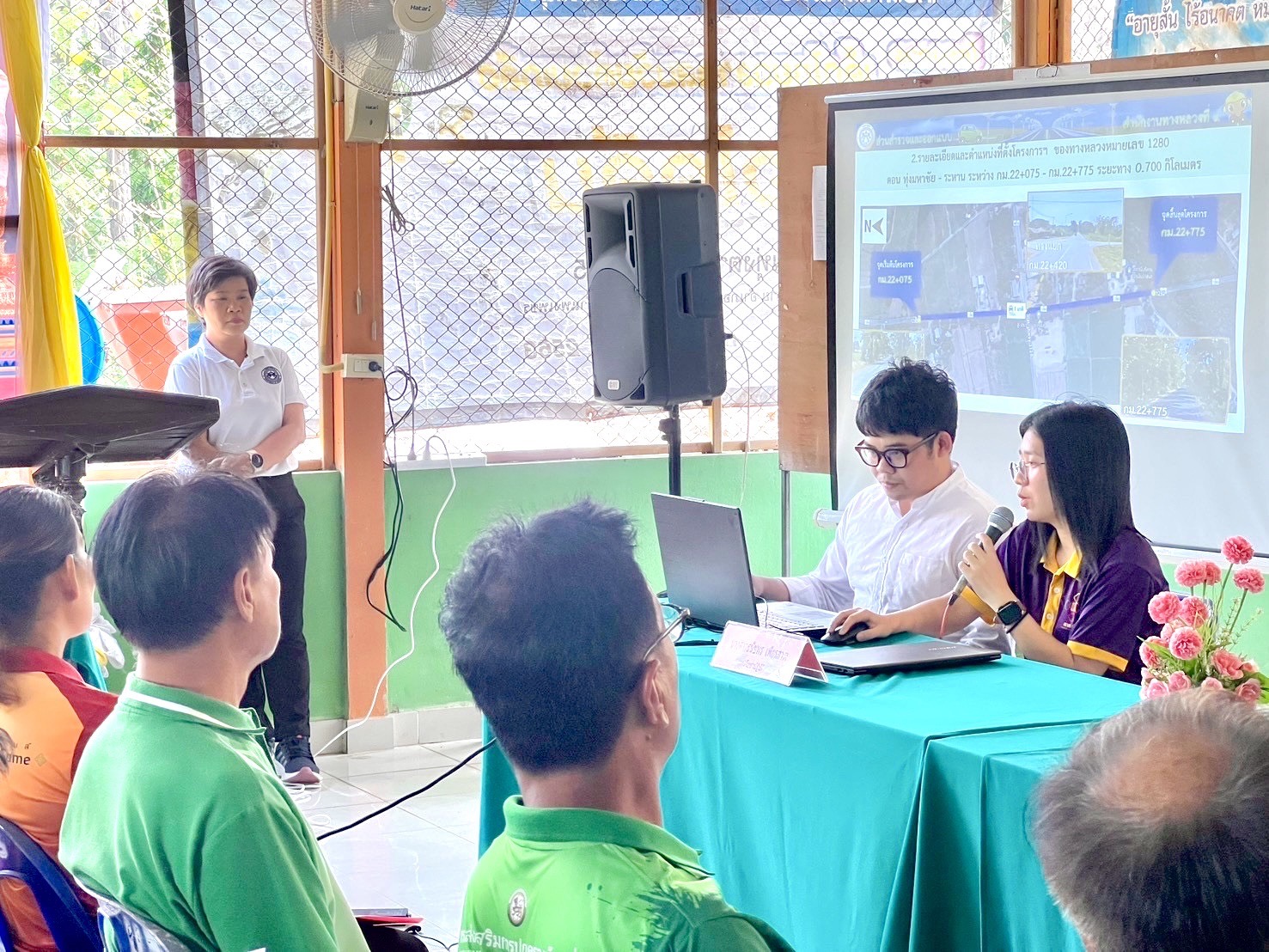 นายชัยศิริ ผูกใจเพื่อน ผู้อำนวยการแขวงทางหลวงกำแพงเพชร มอบหมายให้ นายสุชาติ ตาทิพย์ รองผู้อำนวยการ ฝ่ายวิศวกรรม พร้อมด้วยนายเดชา กุลกิจวโรภาส รองผู้อำนวยการ ฝ่ายปฏิบัติการ และนางปารียา เกตุทิม รองผู้อำนวยการ ฝ่ายบริหาร นำคณะเจ้าหน้าที่ในสังกัด จัดประชุมการมีส่วนร่วมของประชาชน เพื่อปรับปรุงทางแยกเพิ่มความปลอดภัย โครงการก่อสร้างโครงข่ายทางหลวงแผ่นดิน กิจกรรมก่อสร้างเพิ่มประสิทธิภาพทางหลวง งานก่อสร้างเพิ่มประสิทธิภาพทางหลวง ทางหลวงหมายเลข 1280 ตอน ทุ่งมหาชัย - ระหาน ระหว่าง กม.22+075 - กม.22+775 ท้องที่ ต.ทุ่งทราย อ.ทรายทองวัฒนา จ.กำแพงเพชร ณ ศาลาประชาคมบ้านทุ่งตากแดด หมู่ที่ 5 ในการนี้ นายสุธน สังข์ทอง นายกเทศมนตรีตำบลทุ่งทราย ให้เกียรติเป็นประธานในพิธีเปิดการประชุม ซึ่งในที่ประชุมมีมติเห็นด้วยในการให้ดำเนินโครงการ